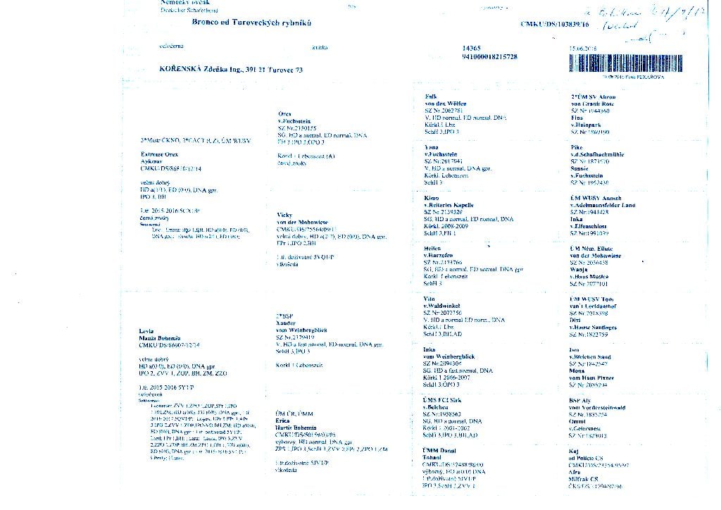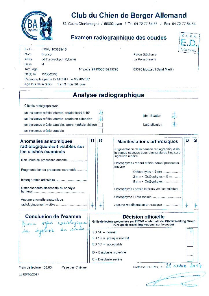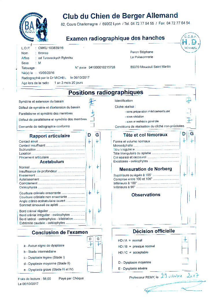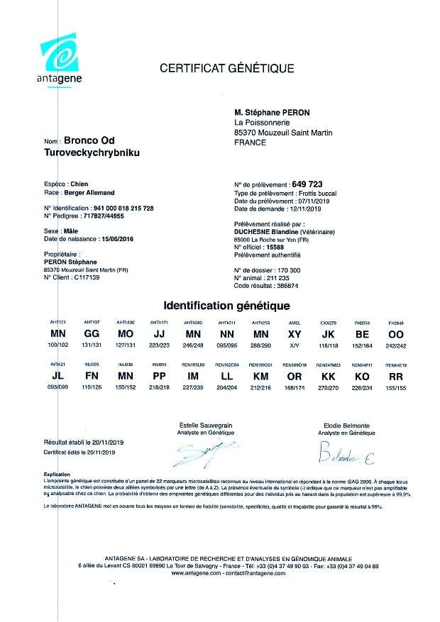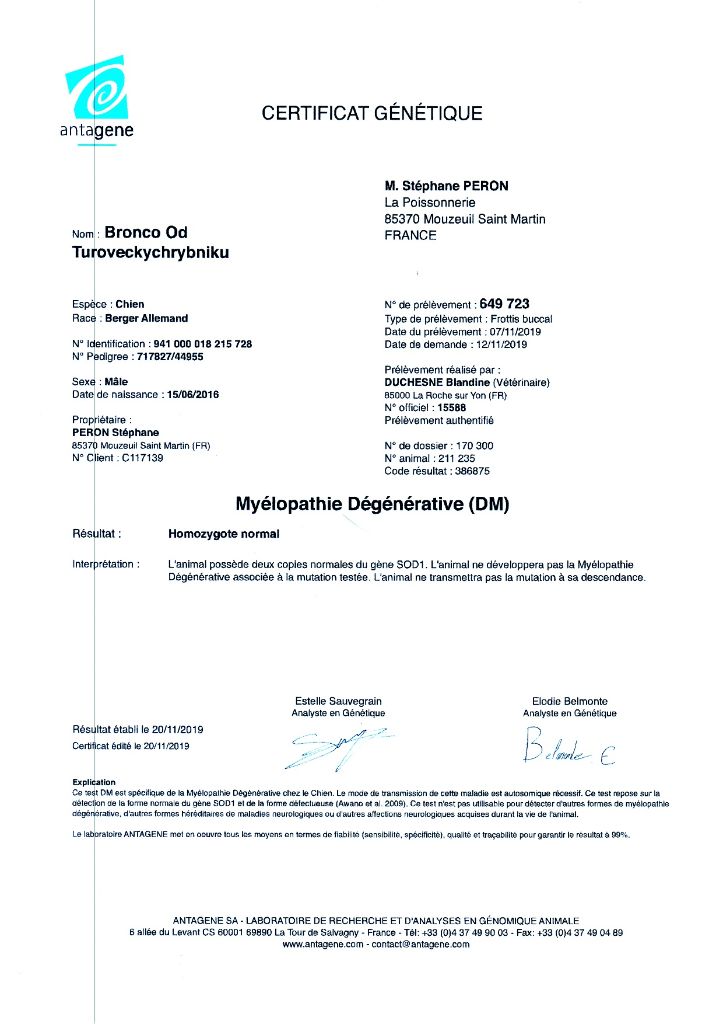 ADN : Emprunte Dysplasie d la hanche : HD/A Myélopathie dégénérative : absence dysplasie des coude : ED/O |